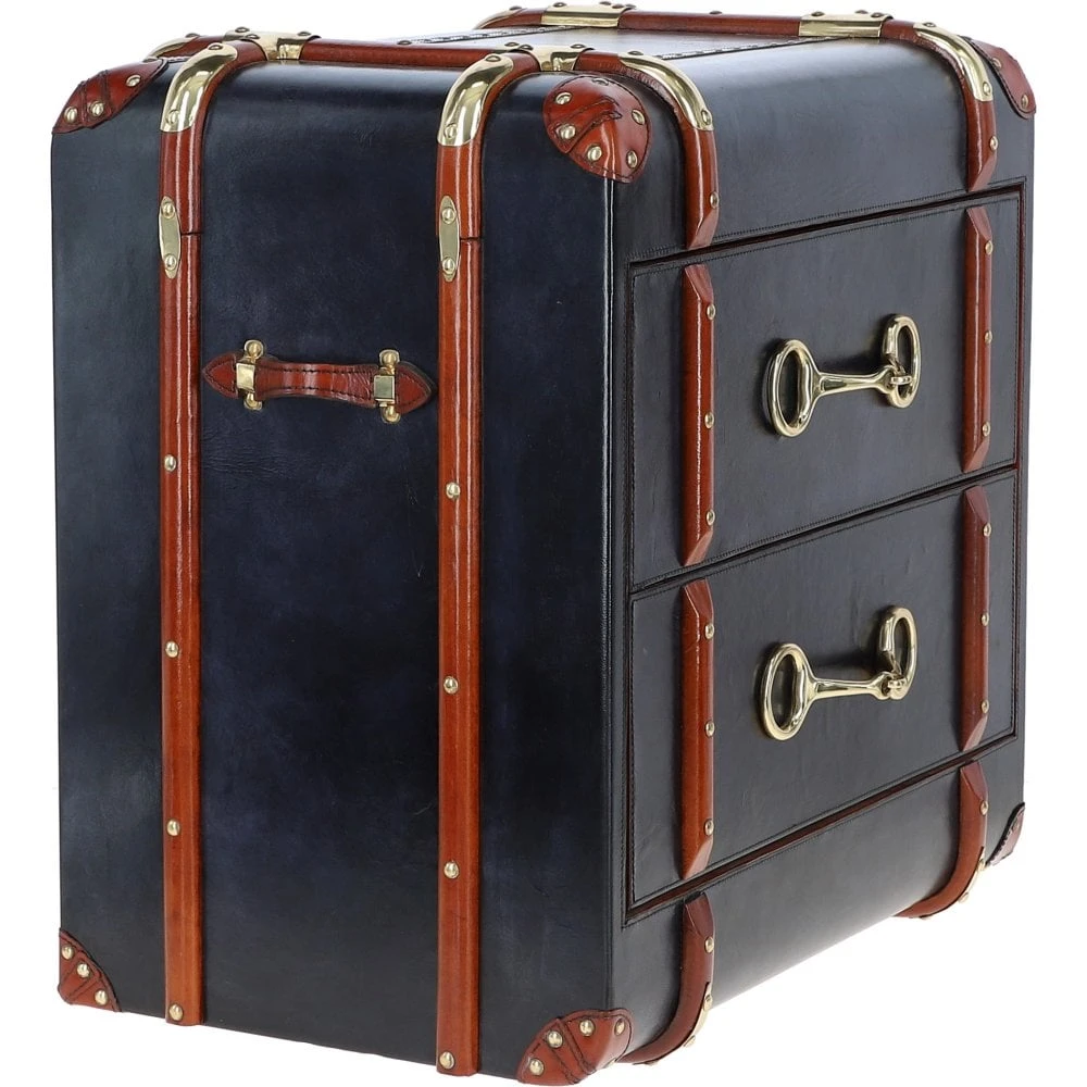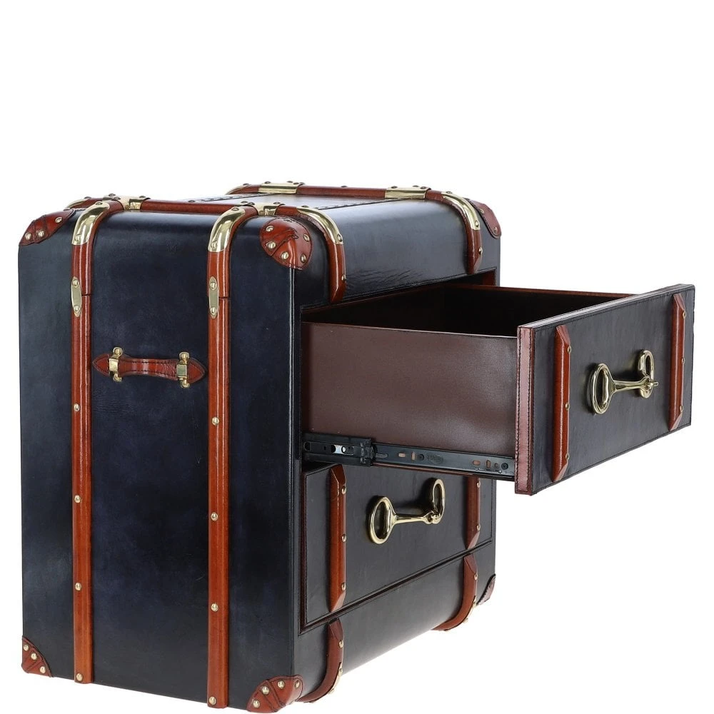 Experience the allure of bygone eras with our Vintage Bedside Leather Drawer. Expertly fashioned from luxurious, deep brown leather, this masterpiece radiates sophistication and finesse. The brilliant brass adornments and intricate studded patterns accentuate its retro charm, making it the perfect statement piece for your bedroom.