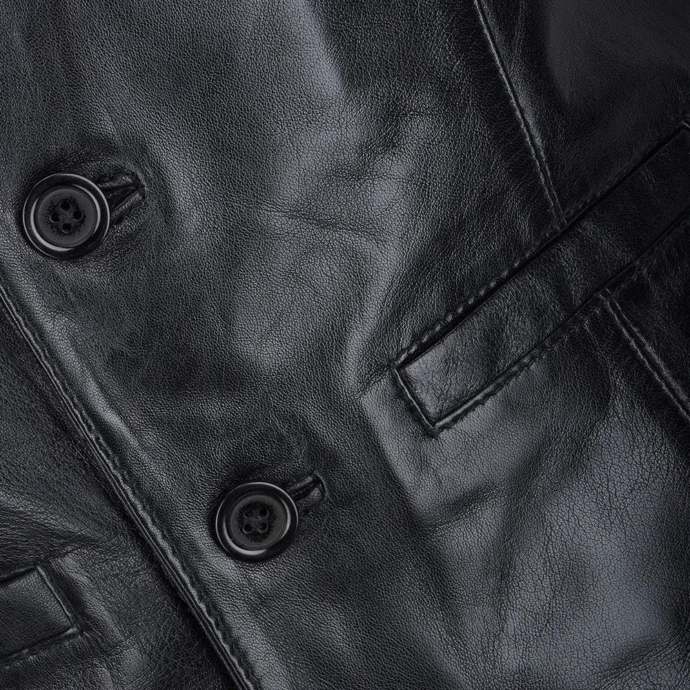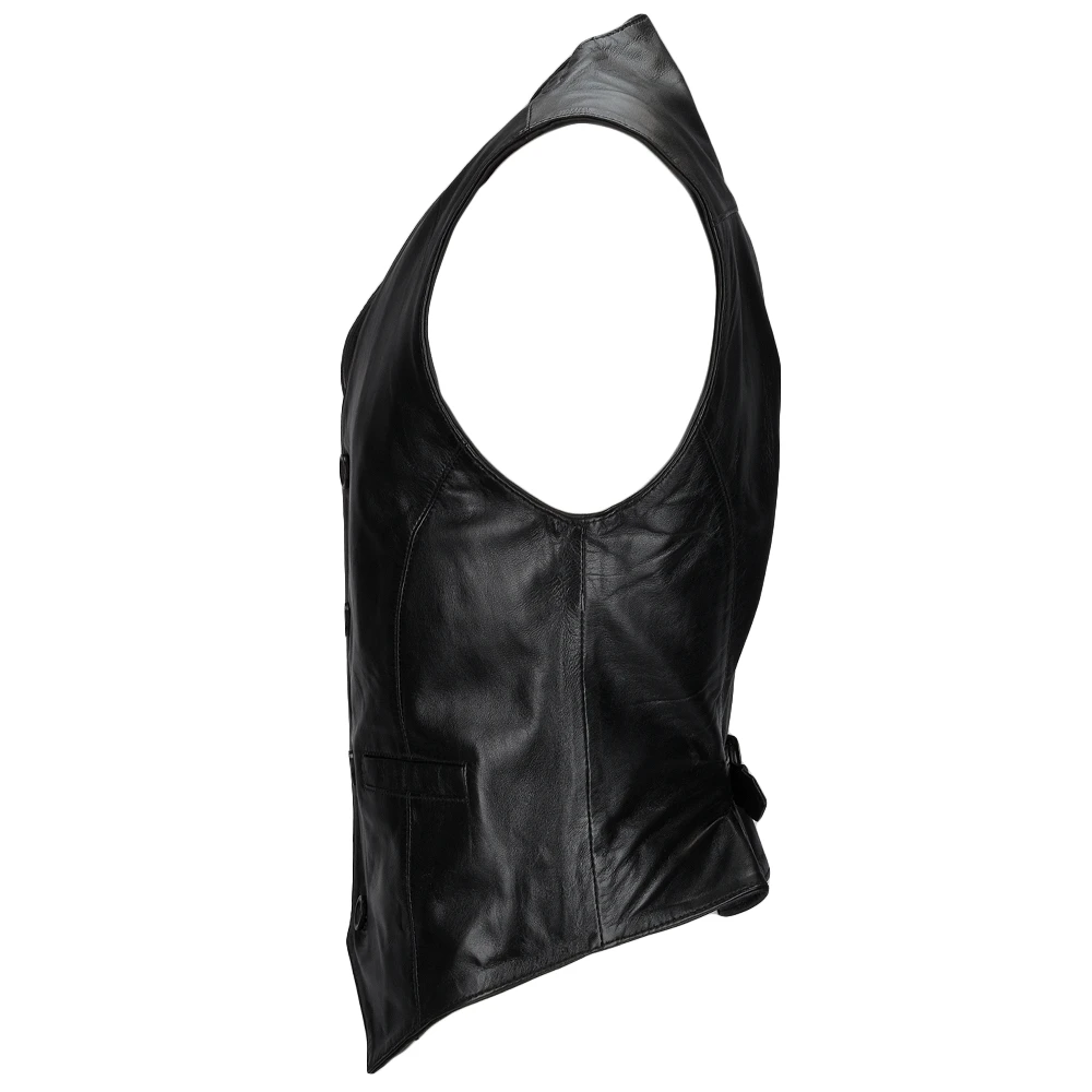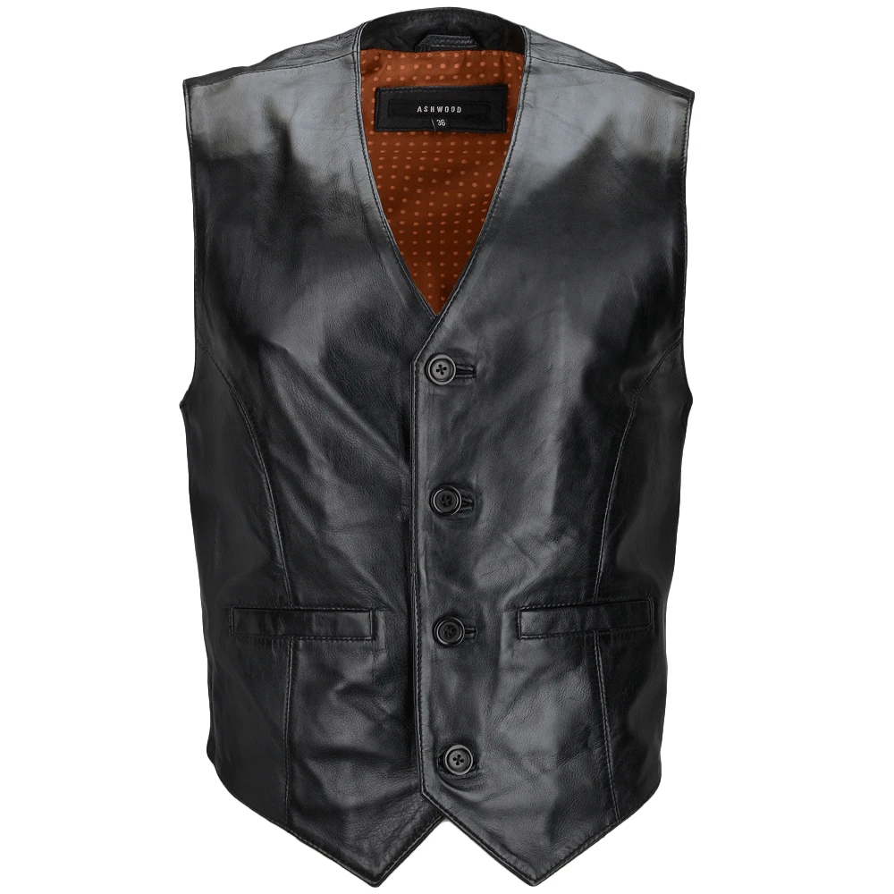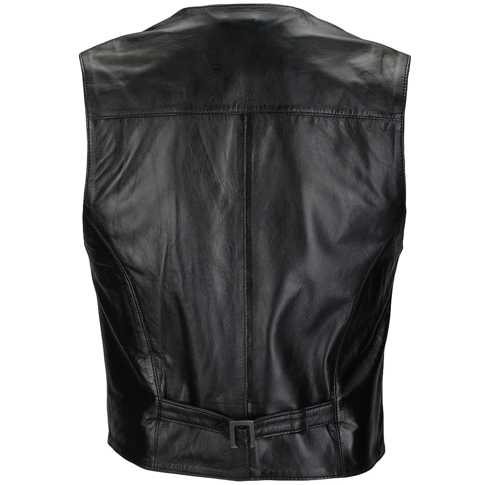 This timeless front and back leather waistcoat has been crafted from soft nappa leather. Tailored to perfection Coloured in black, complete with four button fastening, and an all leather adjustable strap to ensure a comfortable fit.
