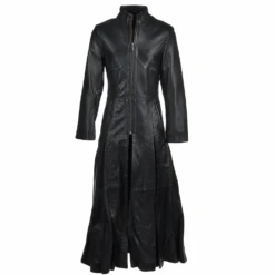 Stylish with a short collar and long in length this black Gothic matrix style coat is crafted in beautiful leather with impressive pleat detailing, and a silhouette finish. Fully lined with side pockets to the external of the body.