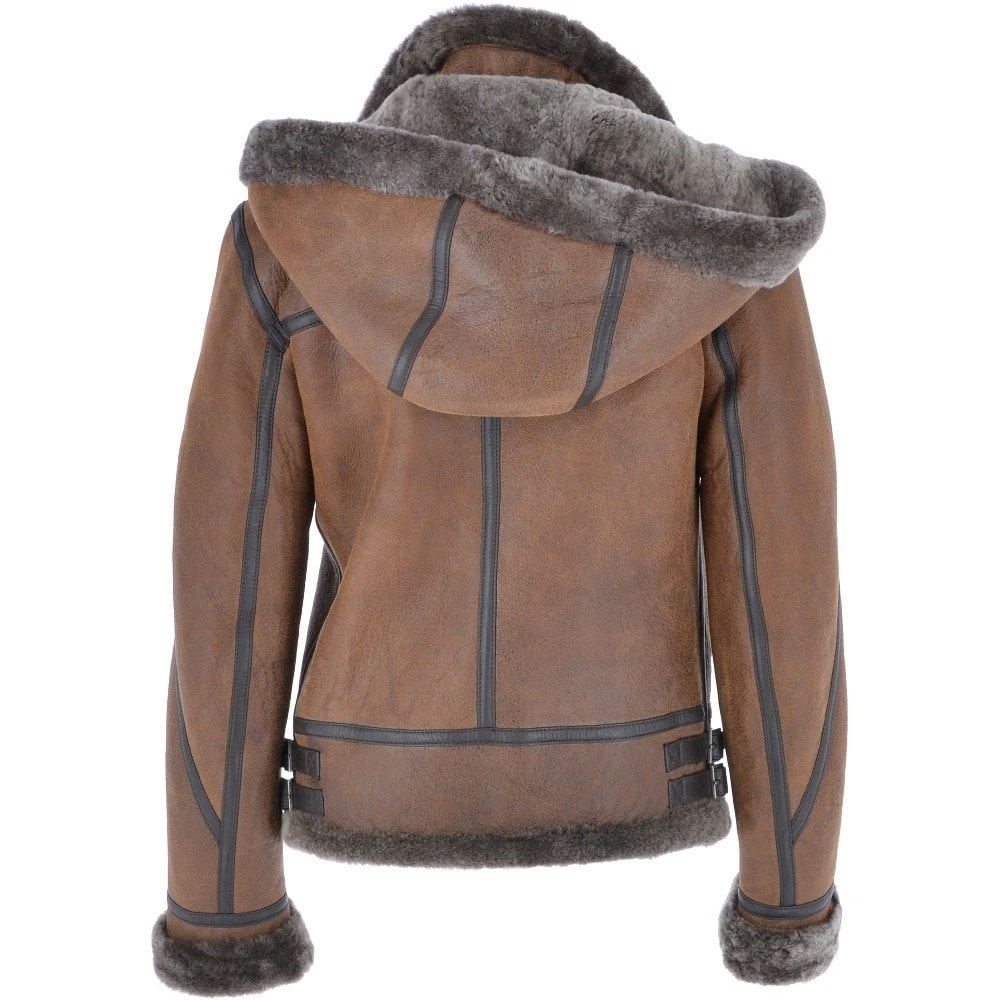 Online and exclusive to Leather Company. Aster is a cosy pilot hooded sheepskin jacket, coloured in tobacco with a soft hand buffed leather finish to give a luxury to touch feel. Expect a zip closure fastening, a detachable sheepskin hood, and two functional hand pockets and optional turn up cuffs.
