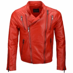 An iconic symbol of rebellious attitude, the Zeppelin men’s leather jacket in red brings that streetwear edge look, to the classic leather biker jacket.