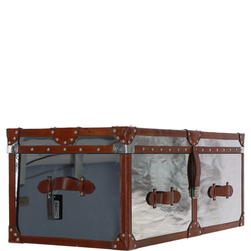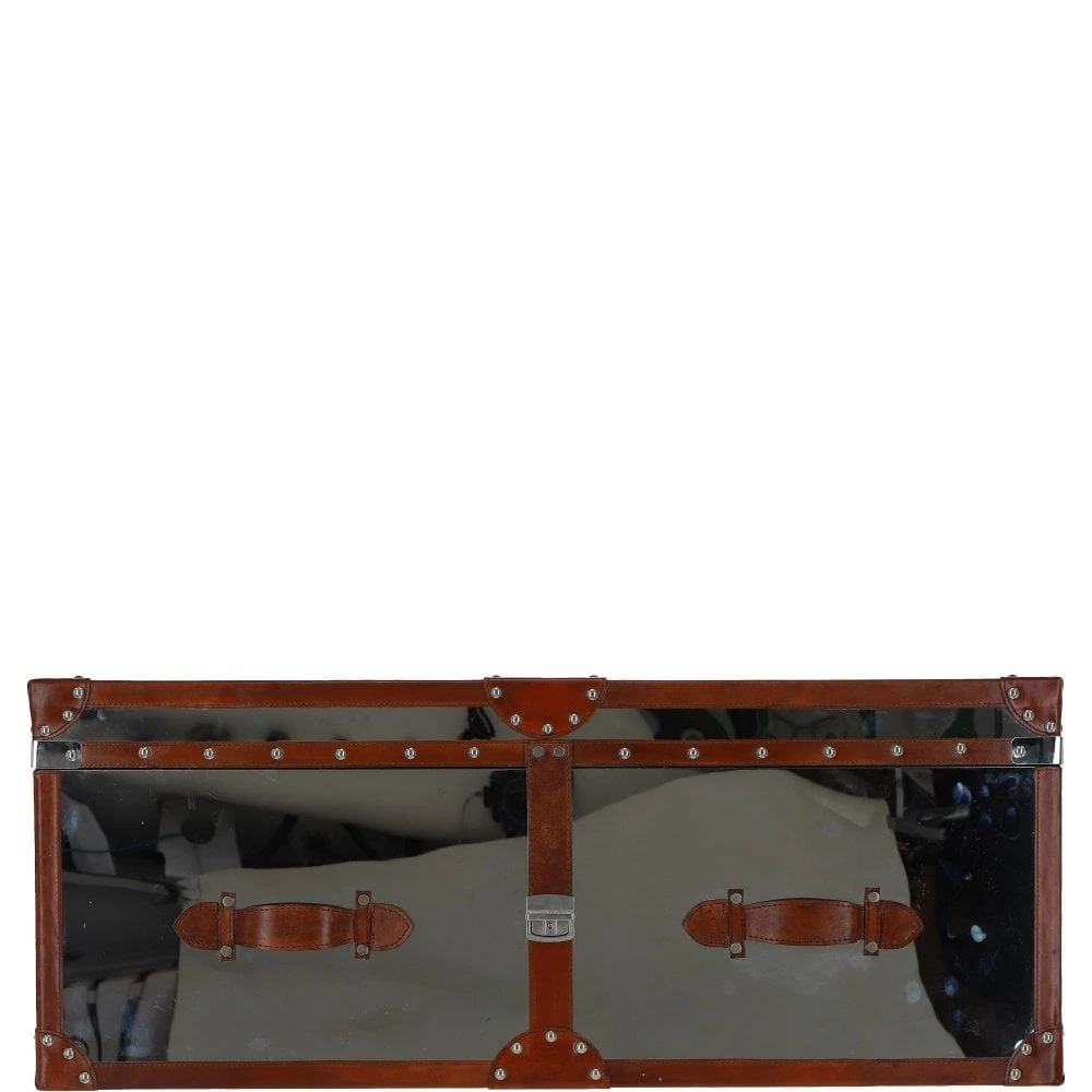 Wood and Aluminium Mirror Trunk with Brown Leather Trim and Stud Detailing: AGC 890